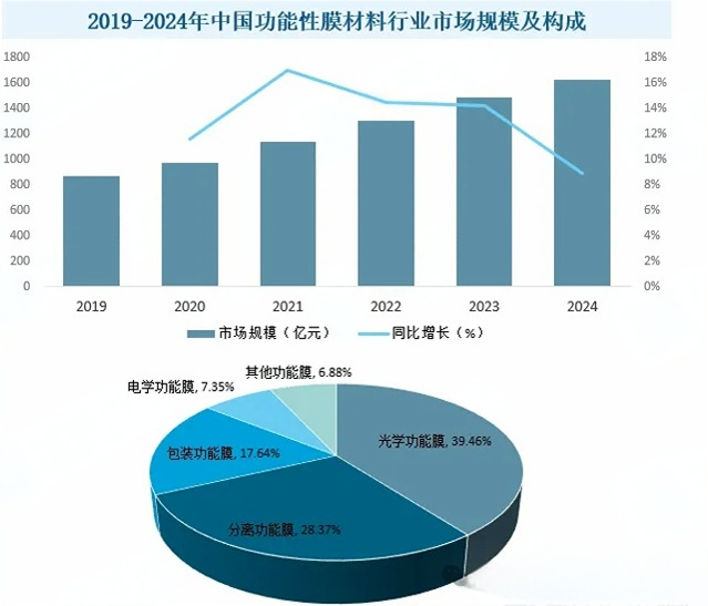 功能性膜材料是我国新材料自主创新发展需攻克的重点材料之一,对我国先进制造业高质量发展具有重要促进作用,近年来,受益于新型显示、新能源、节能环保等下游领域需求扩张影响,我国功能膜材料市场需求与日俱增,市场规模持续扩容,据统计,2024年我国功能膜材料行业市场规模达1623亿元,同比增长8,9%,其中,光学功能膜约占39 神马影院在线,46%,分离功能膜约占28,37%,包装功能膜约占17,64%,电学功能膜约占7,35%。。