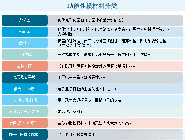功能性膜材料是指具有光学,电学,分离,阻隔等一种或多种功能的膜材料,是新材料产业的重要分支,功能性膜材料可以分为光学膜,含氟膜,铝塑膜,反渗透膜,柔性PI膜,高导热石墨膜,偏光片PVA膜 神马影院高清,异方性导电胶膜,高性能水汽阻隔膜,聚酯膜(PET膜),质子交换膜(PEM)等类型。