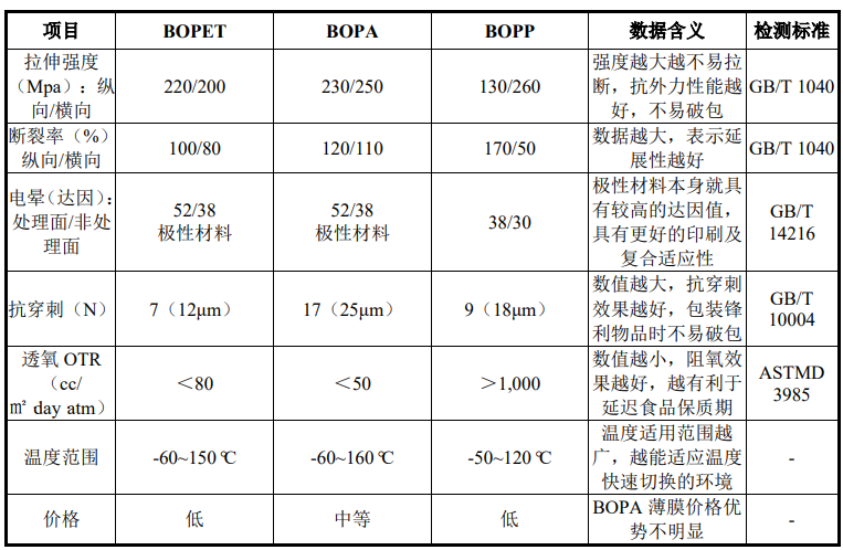与 BOPP、BOPET 等竞争材料相比,BOPA 薄膜在拉伸强度、氧气阻隔性、耐温性上有优势,但成本较高。