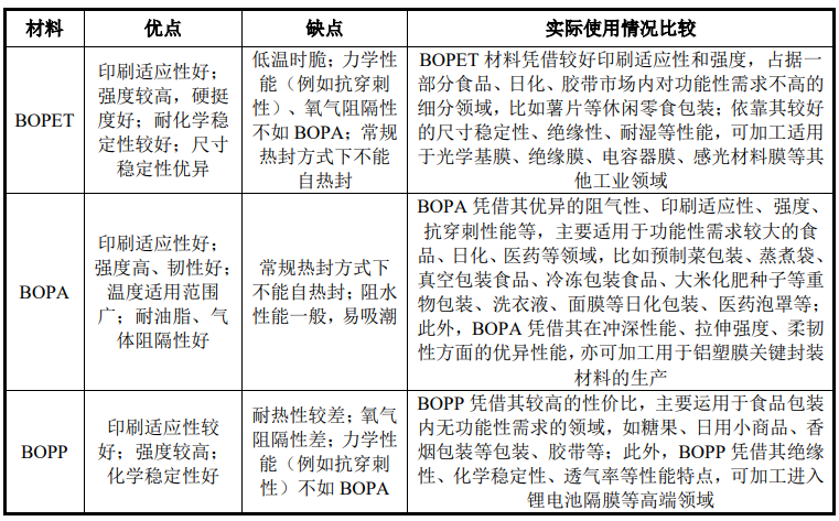 2、BOPET、BOPA、BOPP薄膜实际使用情况对比