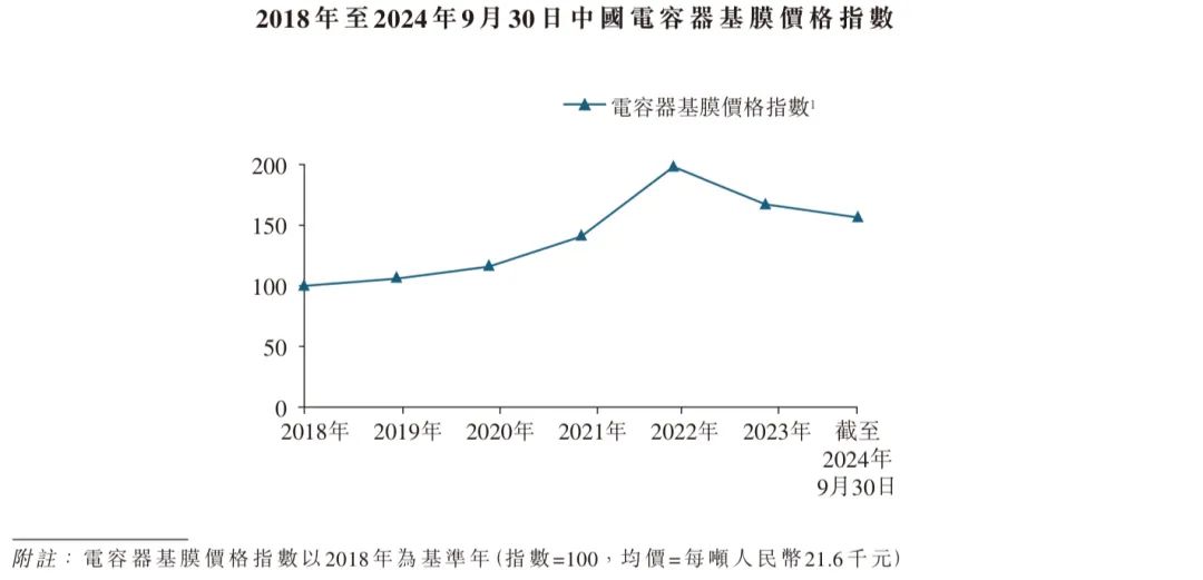2018 年至2022 年,中国电容器基膜价格指数呈现上涨趋势,但2022 年后开始逐渐下降。此波动主要是由(i) 生产电工级聚丙烯的主要原材料原油的价格因俄乌冲突而波动,及(ii) 强劲的下游需求所推动,反映出电容器薄膜在各行各业中的应用日益广泛。