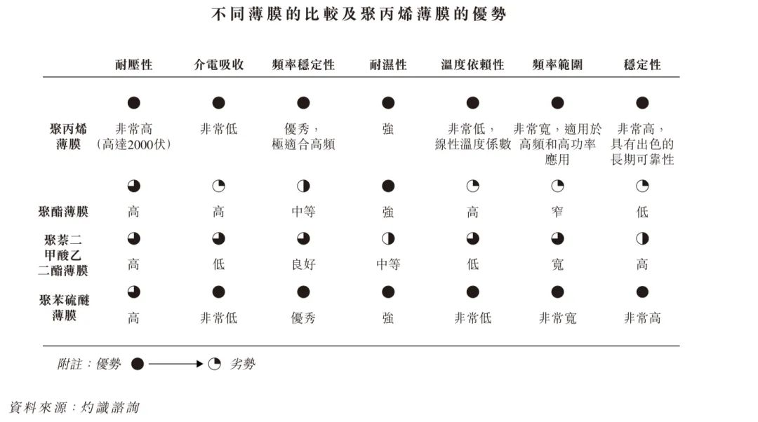 替代铝电解电容器:薄膜电容器正逐渐取代铝电解电容器,原因在于薄膜电容器具有卓越的耐电压性、更好的高频稳定性及更长的使用寿命。铝电解电容器的耐电压上限为650 至670 伏,而薄膜电容器可达到2000 伏或更高,这使得薄膜电容器更适用于高电压应用场景,尤其适用于新能源汽车和新能源电力系统。