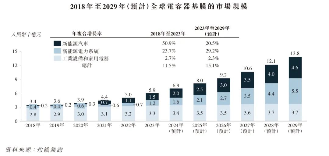 随着中国新能源汽车市场的迅速发展,充电站及电动驱动系统对薄膜电容器的需求正不断上升。在新能源电力系统方面,中国大力推动太阳能、风能及储能,增加了对电力转换设备的需求,刺激了对薄膜电容器的需求。中国薄膜电容器市场的规模由2018 年的人民币43 亿元增至2023 年的人民币108 亿元,年复合增长率为20.1%,预计到2029 年将达到人民币287 亿元,年复合增长率为17.8%。